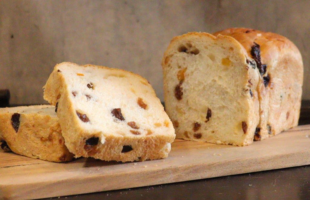 周年限定食パンは、クリームチーズやドライフルーツを練り込んだ、もっちりふわふわの食パンになっております♪