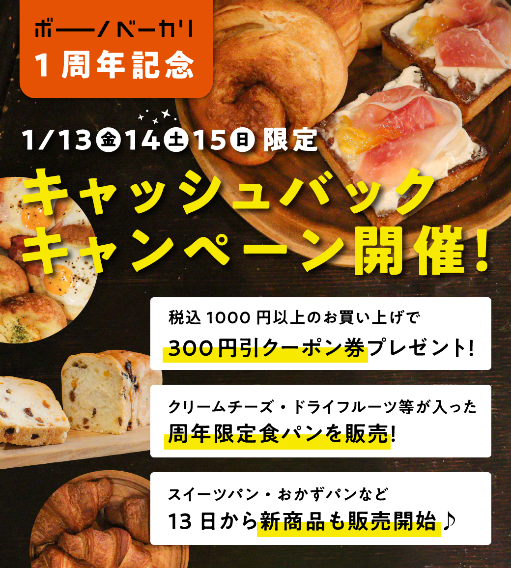 【ボーノベーカリ1周年】1/13(金)からの3日間で周年フェアを開催いたします